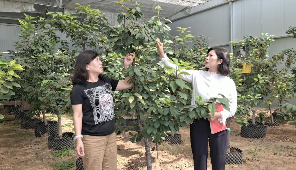 新路村黨支部書記、村委會(huì)主任劉翠萍與“櫻桃樹下”種植園有關(guān)負(fù)責(zé)人察看櫻桃長勢(shì)。張林泉 攝