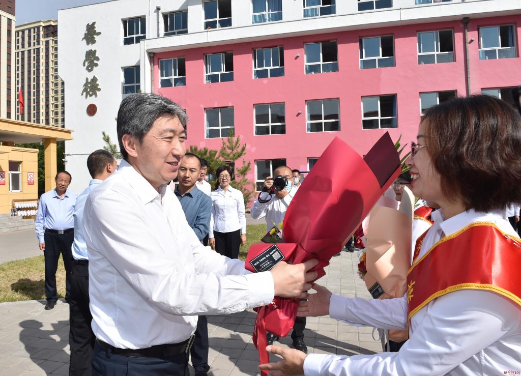 每到一處,朱曉東都與教師們深入交流,了解學(xué)校建設(shè)發(fā)展情況,關(guān)切詢問他們的工作生活情況,感謝他們?yōu)槲沂薪逃聵I(yè)發(fā)展作出的貢獻(xiàn),并為優(yōu)秀教師代表送上了鮮花,祝他們節(jié)日快樂。朱曉東指出,新一屆省委、省政府作出構(gòu)建“一群兩區(qū)三圈”城鄉(xiāng)區(qū)域發(fā)展新格局的重大戰(zhàn)略部署,明確提出“強(qiáng)勢打造太忻一體化經(jīng)濟(jì)區(qū)北引擎,引領(lǐng)帶動忻州與太原、雄安新區(qū)相向發(fā)展,打造我省融入京津冀和服務(wù)雄安新區(qū)的重要走廊”,賦予忻州“建設(shè)開放發(fā)展前沿城市”的戰(zhàn)略定位,忻州發(fā)展迎來了前所未有、千載難逢的重大機(jī)遇。不論是太忻一體化經(jīng)濟(jì)區(qū)建設(shè),還是建設(shè)開放發(fā)展前沿城市,都離不開人才的支撐。希望廣大教育工作者身在學(xué)校、心系全局,秉持“負(fù)責(zé)任、動腦筋、講良心”的工作要求,潛心教學(xué)鉆研、立德樹人,以更加飽滿的熱情投身教育事業(yè),為忻州經(jīng)濟(jì)社會發(fā)展培養(yǎng)更多的優(yōu)秀人才。