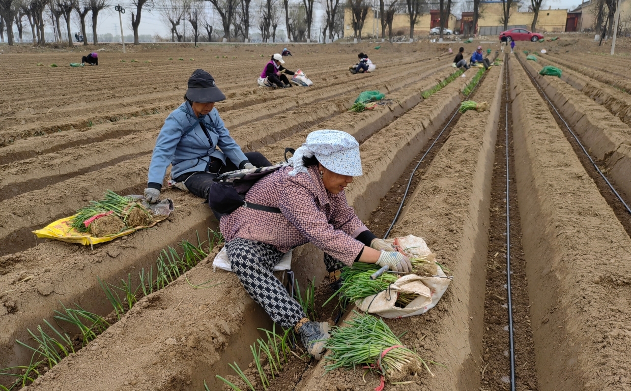 4月6日,定襄縣黃咀村寬廣的農(nóng)田里,村民正熟練地進(jìn)行蔥苗種植。