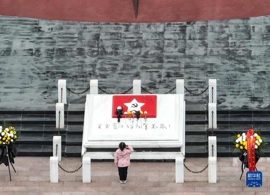 4月4日,在貴州省遵義市紅軍烈士陵園,一名小朋友在紅軍烈士紀念碑前敬少先隊隊禮,緬懷先烈(無人機照片)。 清明時節(jié),各地干部群眾通過形式多樣的活動,銘記歷史、緬懷英烈、寄托哀思。 新華社發(fā)(羅星漢攝)