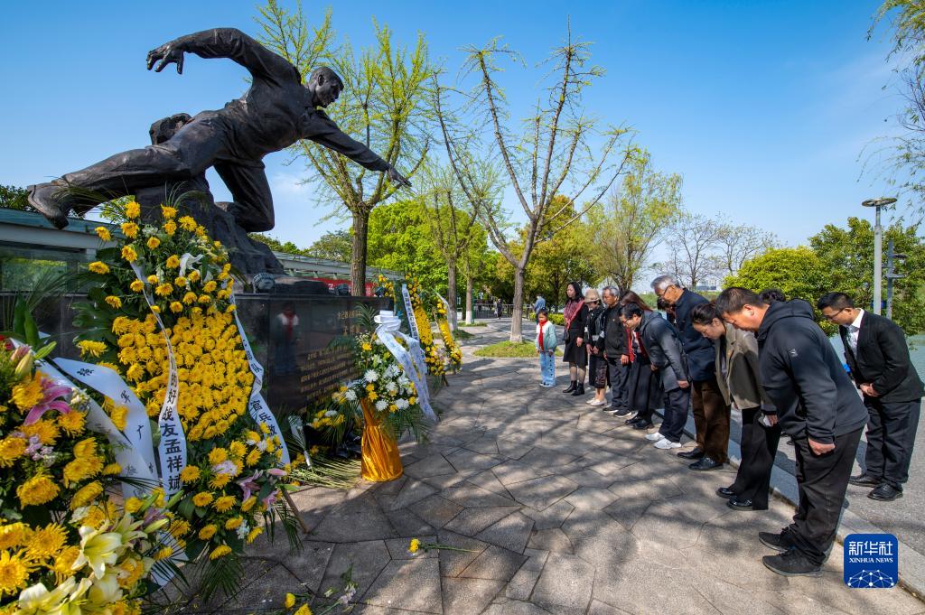 4月4日,浙江省金華市城南橋橋頭孟祥斌烈士塑像前,市民向英雄鞠躬致敬。 清明時節(jié),各地干部群眾通過形式多樣的活動,銘記歷史、緬懷英烈、寄托哀思。 新華社發(fā)(胡肖飛攝)