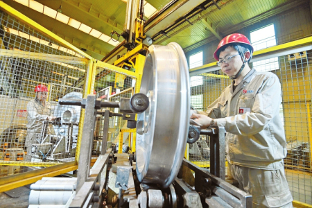 俯瞰窗外,流水線上一片片锃光瓦亮的車輪正快速產出,等待裝車發(fā)貨??刂剖依?,參觀者依然興趣盎然,仔細傾聽著、品味著“太重制造”自主創(chuàng)新的故事……