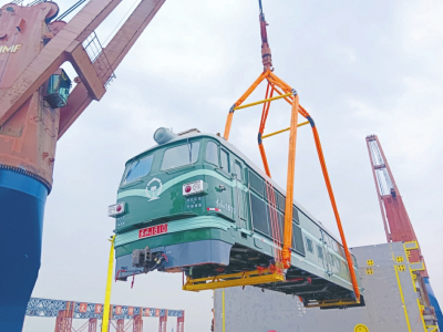 東風(fēng)4B內(nèi)燃機車體作為中國鐵路第二代電傳動內(nèi)燃機車的代表車型,是中國鐵路史上產(chǎn)量最大、運用最廣泛、技術(shù)最成熟的內(nèi)燃機車車型之一。因車體單件長達22米、重達87噸,且沒有固定吊點、重心難尋,致使其吊裝不同于以往發(fā)運貨類,吊裝過程極易出現(xiàn)傾斜等情況,吊裝難度系數(shù)極高,需兩臺船吊采用“兜吊”的軟吊方式進行作業(yè),這對作業(yè)司機的操作提出了極高的要求,必須做到“三個同步”:兩臺船吊起吊高度同步、起升速度同步、轉(zhuǎn)向頻率同步。