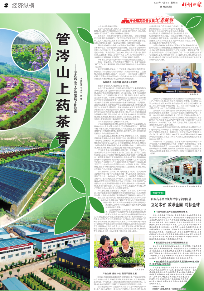 為促進(jìn)寧武藥茶專業(yè)鎮(zhèn)高質(zhì)量發(fā)展,寧武縣以優(yōu)質(zhì)資源要素為支撐,堅(jiān)持政府扶持、企業(yè)管理、市場(chǎng)運(yùn)作、整合推進(jìn)的原則,全縣實(shí)施包括“市場(chǎng)主體倍增”“創(chuàng)新能力提升”“就業(yè)富民賦能”“質(zhì)量品牌提升”“銷(xiāo)售市場(chǎng)拓展”“重大項(xiàng)目攻堅(jiān)”和“產(chǎn)業(yè)要素保障”等在內(nèi)的七大行動(dòng),以1軸4鎮(zhèn)10村為承載主體,產(chǎn)銷(xiāo)緊密銜接,三產(chǎn)深度融合,縱向延鏈和橫向成群并舉,藥茶藥材和功能食品互促,推動(dòng)藥茶產(chǎn)業(yè)由成型向成勢(shì)躍升。