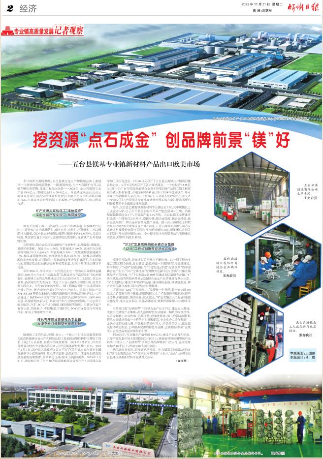 乘風(fēng)破浪會有時,直掛云帆濟滄海。作為國家工信部認(rèn)定的首批“鎂行業(yè)規(guī)范企業(yè)”和“國家級專精特新‘小巨人’企業(yè)”,必將為五臺縣建設(shè)鎂基新材料專業(yè)鎮(zhèn)增光添彩。 (金俊賢)