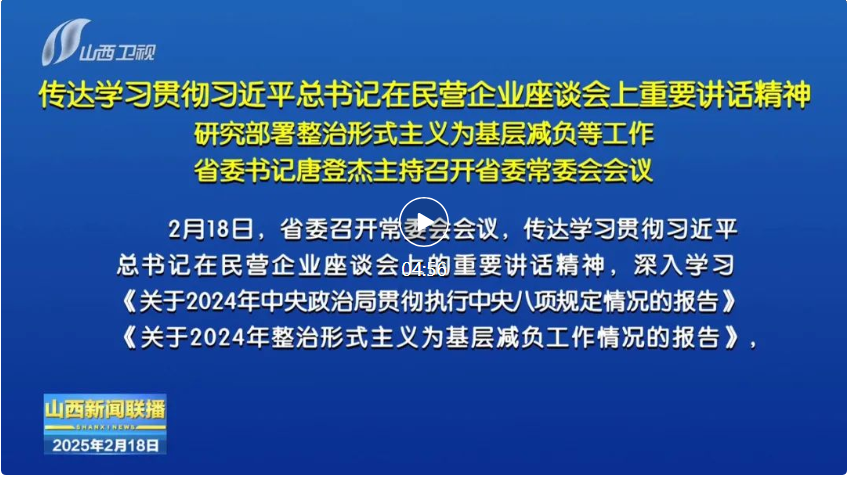 山西日?qǐng)?bào)報(bào)道 2月18日,省委召開(kāi)常委會(huì)會(huì)議,傳達(dá)學(xué)習(xí)貫徹習(xí)近平總書記在民營(yíng)企業(yè)座談會(huì)上的重要講話精神,深入學(xué)習(xí)《關(guān)于2024年中央政治局貫徹執(zhí)行中央八項(xiàng)規(guī)定情況的報(bào)告》《關(guān)于2024年整治形式主義為基層減負(fù)工作情況的報(bào)告》,傳達(dá)貫徹中央層面整治形式主義為基層減負(fù)專項(xiàng)工作機(jī)制會(huì)議精神,審議通過(guò)《關(guān)于進(jìn)一步深化農(nóng)村改革扎實(shí)推進(jìn)鄉(xiāng)村全面振興的實(shí)施意見(jiàn)》《山西省人大常委會(huì)2025年立法計(jì)劃》《政協(xié)山西省委員會(huì)2025年度協(xié)商計(jì)劃》《政協(xié)山西省委員會(huì)2025年度重點(diǎn)民主監(jiān)督計(jì)劃》。省委書記唐登杰主持會(huì)議。