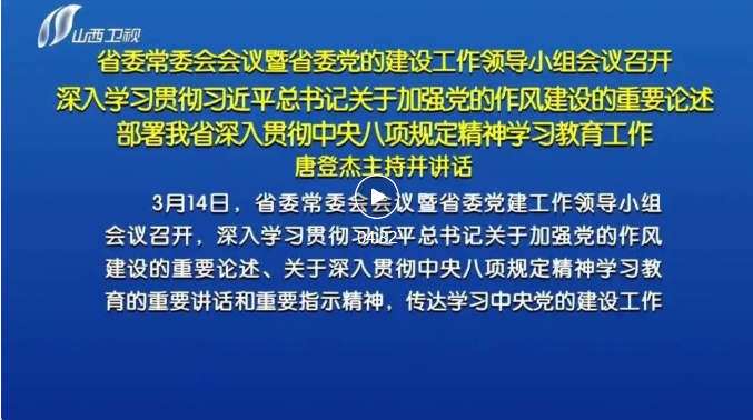 山西日報報道 3月14日,省委常委會會議暨省委黨建工作領導小組會議召開,深入學習貫徹習近平總書記關于加強黨的作風建設的重要論述、關于深入貫徹中央八項規(guī)定精神學習教育的重要講話和重要指示精神,傳達學習中央黨的建設工作領導小組會議精神,按照《關于在全黨開展深入貫徹中央八項規(guī)定精神學習教育的通知》要求,對全省開展學習教育進行安排部署,審議通過《關于在全省開展深入貫徹中央八項規(guī)定精神學習教育的實施方案》。省委書記、省委黨的建設工作領導小組組長唐登杰主持會議并講話。