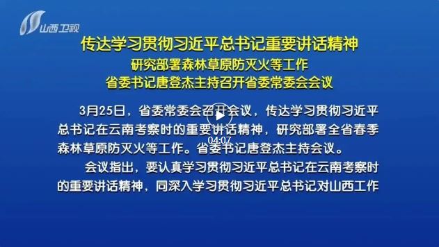 山西日報報道 3月25日,省委常委會召開會議,傳達(dá)學(xué)習(xí)貫徹習(xí)近平總書記在云南考察時的重要講話精神,研究部署全省春季森林草原防滅火等工作。省委書記唐登杰主持會議。