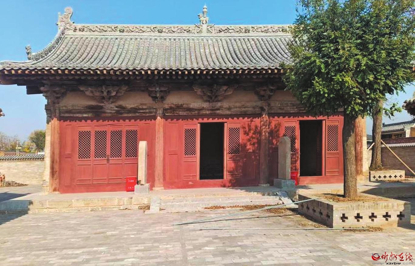七峰寺位于忻府區(qū)董村鎮(zhèn)孫村村北,坐北向南。創(chuàng)建年代不詳,現(xiàn)存一進院布局,中軸線上建筑依次為山門、過殿、大雄寶殿、東西配殿及東西側(cè)耳殿。除大雄寶殿為明代遺構(gòu)外,其余建筑均為清代遺構(gòu)。大雄寶殿面闊三間,進深四椽,單檐懸山頂,五檁無廊式構(gòu)架,斗栱五踩雙昂,平身科施45°斜栱。過殿面闊三間,進深四椽,單檐懸山頂。東西配殿形制同過殿。東西側(cè)耳殿均為單體建筑,單檐懸山頂。