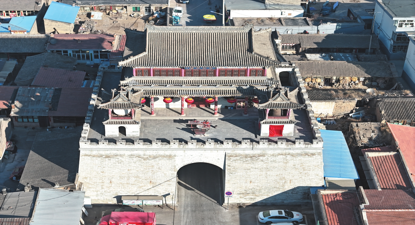 據(jù)重修鼓樓碑和《道光、光緒繁峙縣志》記載,該鼓樓始建于明代萬(wàn)歷十四年(1586),清康熙二十七年(1688)維修,清乾隆二十三年(1758)增設(shè)鐘樓、鼓樓,光緒二年(1878)重修,現(xiàn)存建筑為明、清建筑。城臺(tái)呈方形,條石筑基,青磚鋪面,內(nèi)為夯土。臺(tái)基中設(shè)拱券門洞,南北貫通。城樓內(nèi)供奉文昌神,又稱為文昌閣,面寬五間,進(jìn)深四椽,七檁前后廊構(gòu)架,二層三檐歇山頂,上層斗拱一斗二升交麻葉,下層明間設(shè)拱券門,次間圓形窗,四角施通天柱,內(nèi)設(shè)樓梯,可登二層。