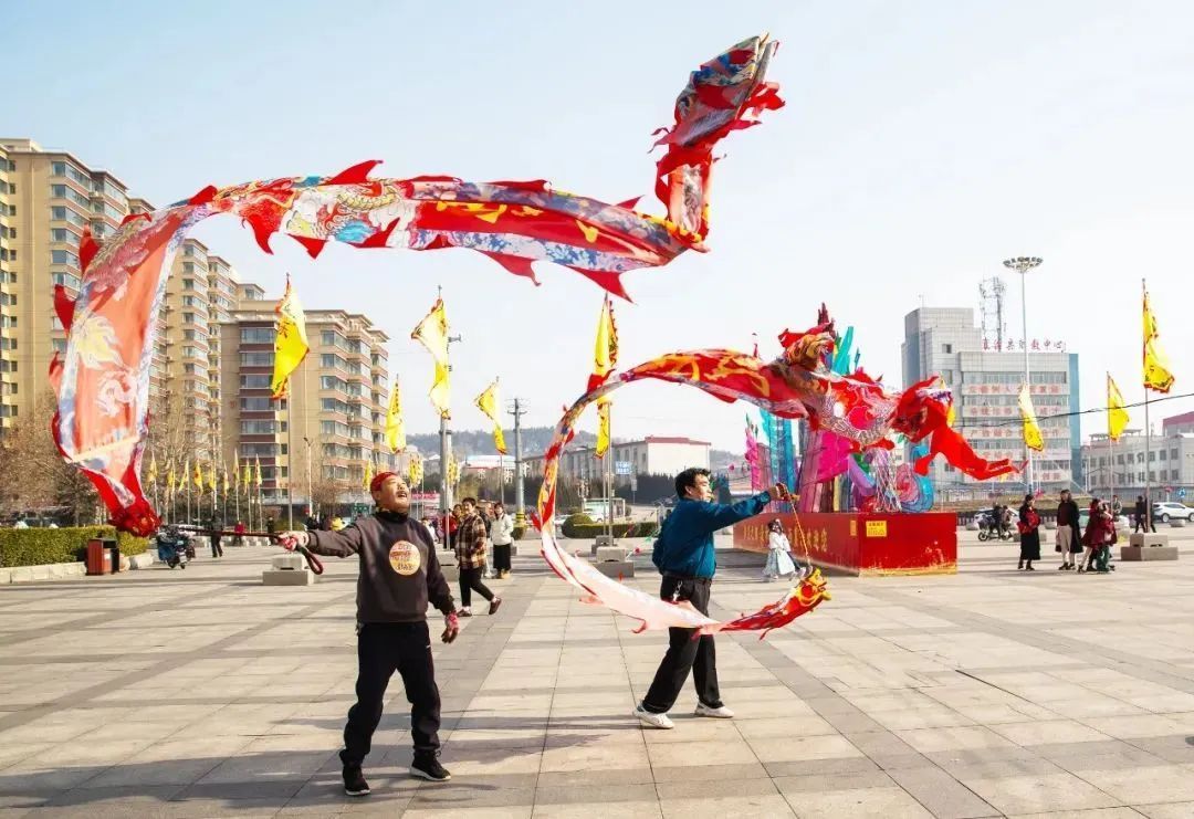 市民在襄汾縣鑼鼓廣場(chǎng)舞動(dòng)龍綢慶祝龍年