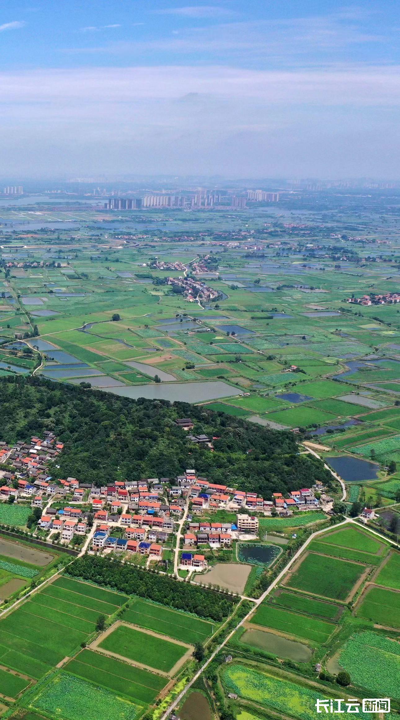 ▲鳥瞰春天的鄂州長(zhǎng)港鎮(zhèn)峒山村,村容整潔、綠樹成蔭