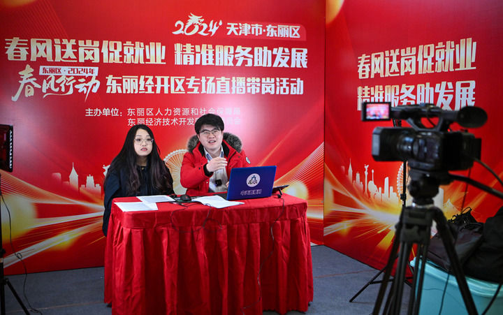2024年2月29日,主播在天津市東麗區(qū)一場(chǎng)招聘會(huì)上進(jìn)行直播帶崗。新華社記者 孫凡越 攝