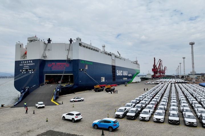 2024年1月23日,在福建廈門東渡港區(qū)現(xiàn)代碼頭,出口車輛陸續(xù)駛上“上汽安吉申誠(chéng)”號(hào)汽車滾裝船(無人機(jī)照片)。新華社記者 姜克紅 攝