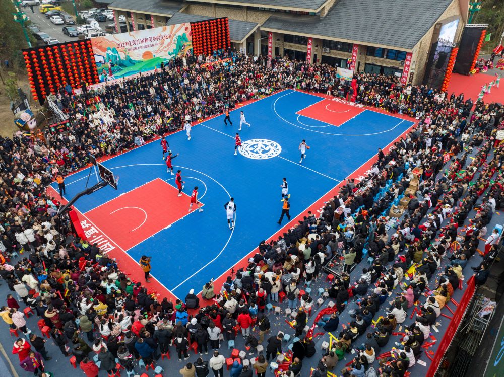 2024年1月29日,村民、游客在現(xiàn)場觀賽(無人機(jī)照片)。當(dāng)日,在四川省宜賓市珙縣巡場鎮(zhèn)三合村,2024宜賓首屆和美鄉(xiāng)村文化節(jié)暨首屆和美鄉(xiāng)村籃球決賽(村BA)舉行,同時,現(xiàn)場還舉行了非遺年貨購物節(jié)、消費券發(fā)放等活動,以賽事經(jīng)濟(jì)激發(fā)鄉(xiāng)村活力。新華社發(fā)(莊歌爾攝)