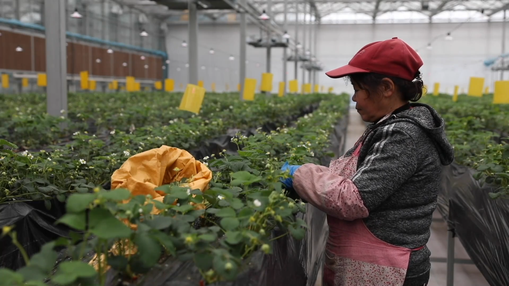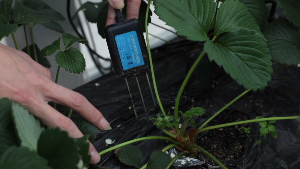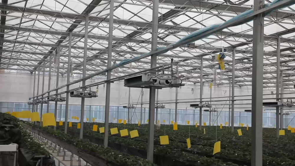 智慧農(nóng)場玻璃溫室現(xiàn)共種植三個品種、八萬株草莓,均為自主繁育的草莓苗??茖W(xué)種植促進(jìn)了豐產(chǎn),兩座玻璃溫室均可實現(xiàn)一年四季連續(xù)生產(chǎn)。