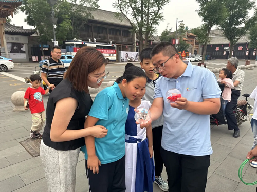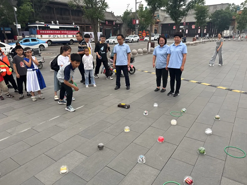 活動現(xiàn)場,在一個特殊的攤位上,由近到遠分別擺放著“冰毒”“海洛因”“搖頭丸”等各種眼花繚亂的毒品仿真模型。“來來來,走過路過不要錯過!”“瞧一瞧,看一看!”禁毒社工在“攤位”前賣力吆喝著,一陣陣吆喝聲引來了眾多游客,游戲通過套圈的方式,組織游客套中現(xiàn)場的毒品模型并準確說出毒品名稱即可獲得扇子、手機支架、帆布包等獎勵。