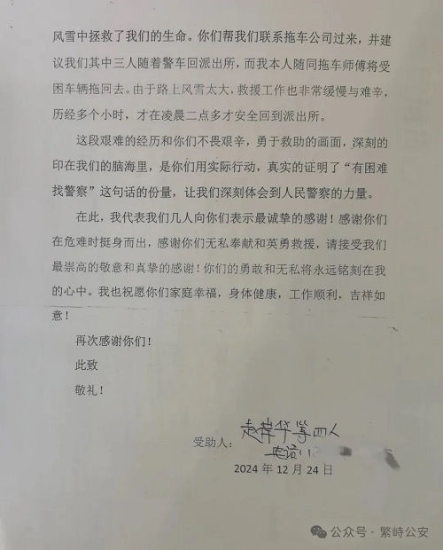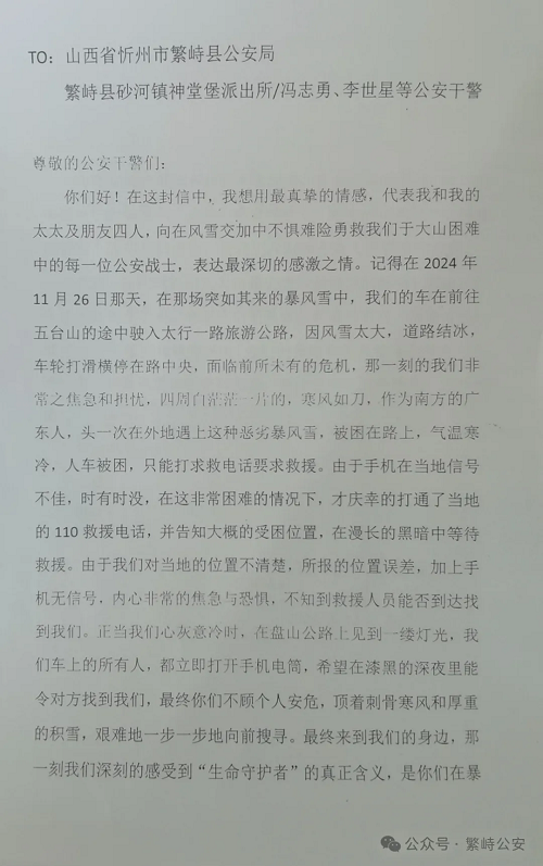 | 繁峙公安民警雪夜救援,司機千里寄信以示感激 |