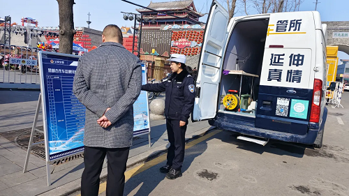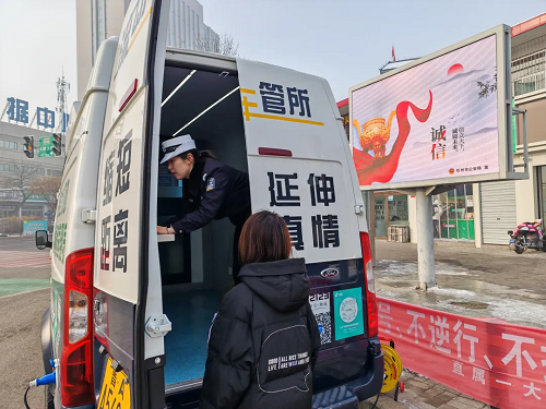 春節(jié)假期,城市、鄉(xiāng)村到處都彌漫著歡樂(lè)祥和的氣氛,初一至初七,在山西省忻州市忻府區(qū)光明西街古城北廣場(chǎng)、公園西街世紀(jì)花苑小區(qū)南門(mén)等人流量大、人員集中場(chǎng)所,忻州市公安局交警支隊(duì)的警郵車(chē)管便民服務(wù)車(chē)格外顯眼?!翱s短距離、延伸真情”,這輛承載著為駕駛?cè)颂峁崆橹艿椒?wù)、為車(chē)輛安全出行提供保障,被群眾稱為“流動(dòng)車(chē)管所”的車(chē)管便民服務(wù)車(chē)讓寒冬暖流涌動(dòng)。
