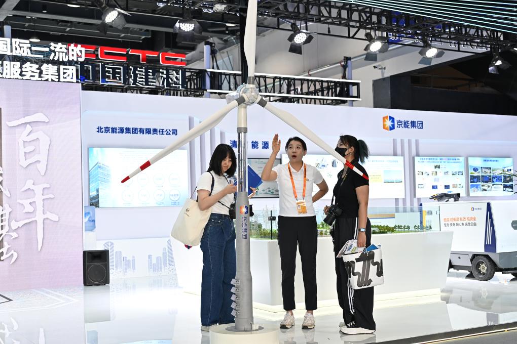 參觀者在服貿(mào)會首鋼園區(qū)京能集團展臺觀看一款新型風機模型。新華社記者 李鑫 攝