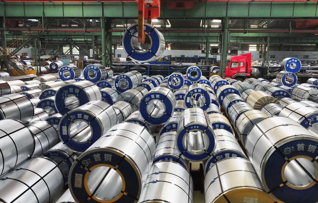 首鋼京唐公司成品車間的吊裝設(shè)備在吊運鋼板(無人機照片)。新華社記者 楊世堯 攝