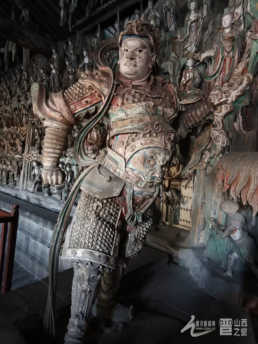 寺內(nèi)擁有總計2000多尊彩塑,大者丈余、小者尺許,每一壁龕為一獨立神話或佛教故事,人物造型生動,神態(tài)逼真,尤其以“千手觀音像”與“韋馱像”最為經(jīng)典。舞蹈《千手觀音》的靈感原型就是這尊千手觀音像。塑像高達數(shù)米,全身貼金,背后伸出上千只手臂,每只手掌上都有一只眼睛,錯落有致,整個造像氣勢恢宏,達到雕塑藝術中和諧、完美的境界。韋馱像巍然肅立,身披甲胄,神情凝重,整個身體呈現(xiàn)出一種微妙的動態(tài)平衡,是明代彩塑中少見的藝術杰作,被譽為“天下第一韋馱”“全國韋馱之冠”。景區(qū)講解員侯麗娟介紹:“這尊塑像的高明之處就在于匠師不落俗套,打破了一般程式的限制,賦予了韋馱一種時間的節(jié)奏性和動作的連續(xù)性,產(chǎn)生了雕塑作品的最高境界‘不動之動’?!?/p>