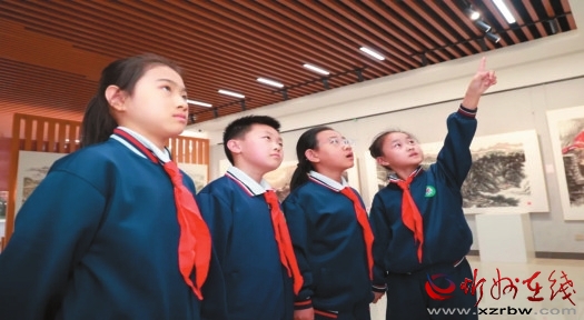 沿著“心靈之塔”臺(tái)階緩步而上,學(xué)生們駐足細(xì)讀,指尖摩挲著書中的文字,如同觸摸智慧的密碼。轉(zhuǎn)入書畫展廳,一幅幅水墨長(zhǎng)卷鋪展開來(lái),學(xué)生們與千年山水完成了一場(chǎng)跨越時(shí)空的對(duì)話。
