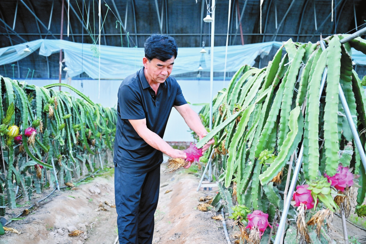鄔瑞華正在觀察火龍果長勢。本報記者馮曉磊攝