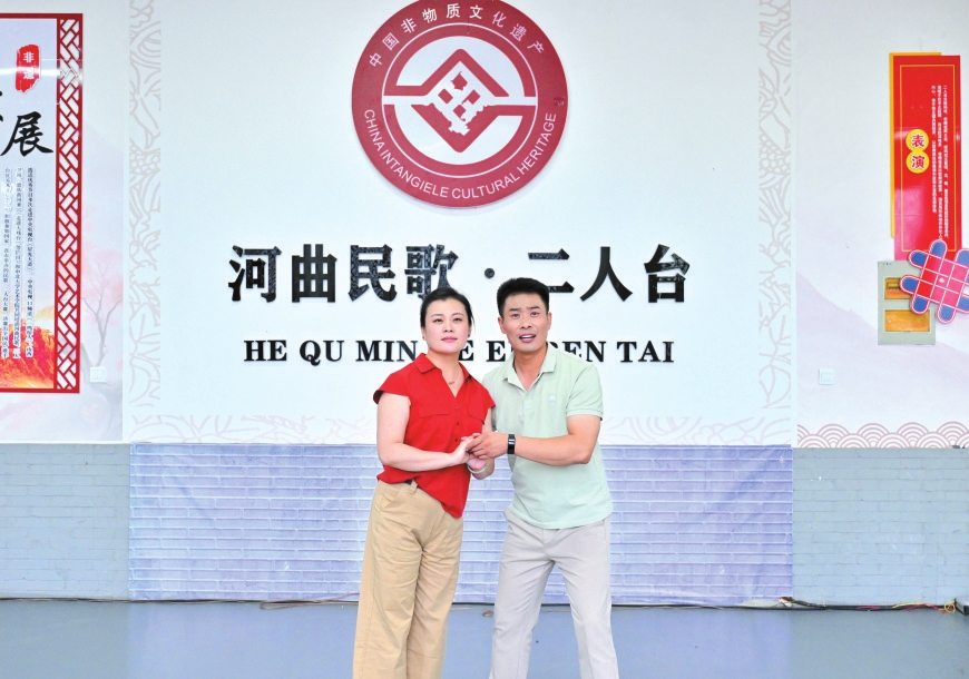 走進(jìn)河曲縣白樸公園,一段清亮婉轉(zhuǎn)的唱腔便隨風(fēng)入耳——河曲縣民歌二人臺(tái)藝術(shù)團(tuán)演員鄔光正和同事們?nèi)橥度耄蚰ゴ笮头沁z音樂(lè)劇《大河長(zhǎng)歌》。他額角滲著細(xì)密的汗珠,當(dāng)唱到“好兒女今日唱長(zhǎng)歌,勝過(guò)了前輩了不得”時(shí),突然停了下來(lái),對(duì)搭檔說(shuō):“再來(lái)一遍,剛才那口氣沒(méi)頂滿?!边@份對(duì)細(xì)節(jié)的較真,藏著他對(duì)二人臺(tái)藝術(shù)最樸素也最深厚的敬畏。