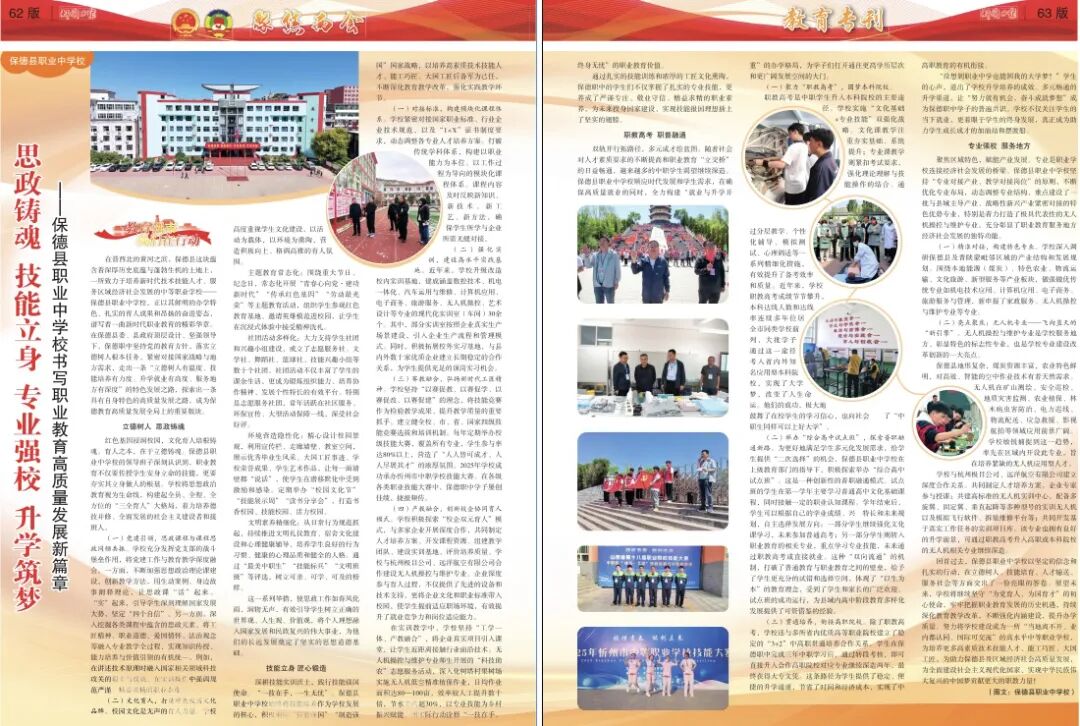 回首過去,保德縣職業(yè)中學(xué)校以堅定的信念和扎實的行動,在立德樹人、技能培育、人才輸送、服務(wù)社會等方面交出了一份亮眼的答卷。展望未來,學(xué)校將繼續(xù)堅守“為黨育人、為國育才”的初心使命,牢牢把握職業(yè)教育發(fā)展的歷史機遇,持續(xù)深化教育教學(xué)改革,不斷強化內(nèi)涵建設(shè),提升辦學(xué)質(zhì)量。努力將學(xué)校建設(shè)成為一所“當(dāng)?shù)仉x不開、業(yè)內(nèi)都認(rèn)同、國際可交流”的高水平中等職業(yè)學(xué)校,為培養(yǎng)更多高素質(zhì)技術(shù)技能人才、能工巧匠、大國工匠,為助力保德縣及區(qū)域經(jīng)濟社會高質(zhì)量發(fā)展,為全面建設(shè)社會主義現(xiàn)代化國家、實現(xiàn)中華民族偉大復(fù)興的中國夢貢獻更大的職教力量!